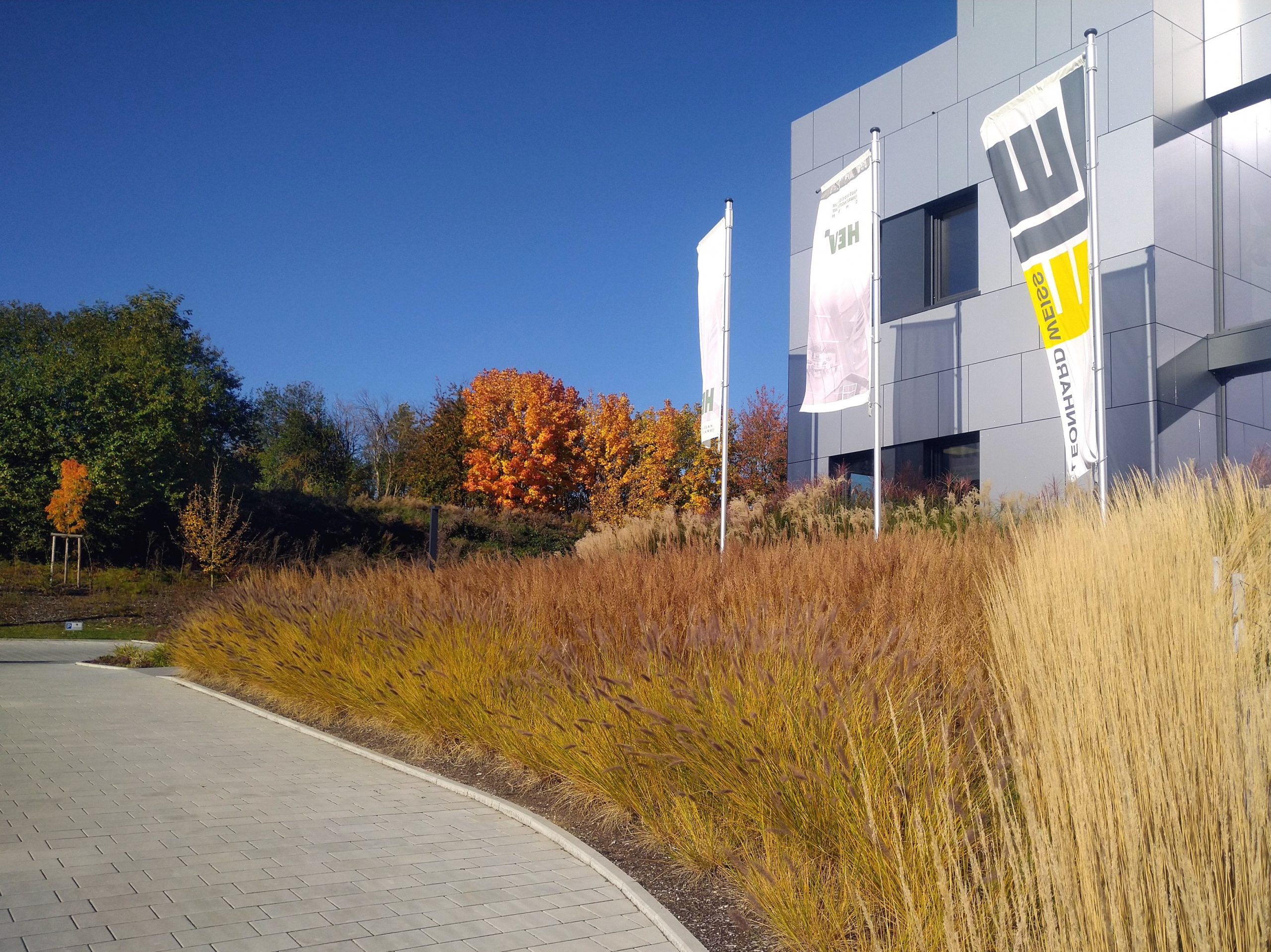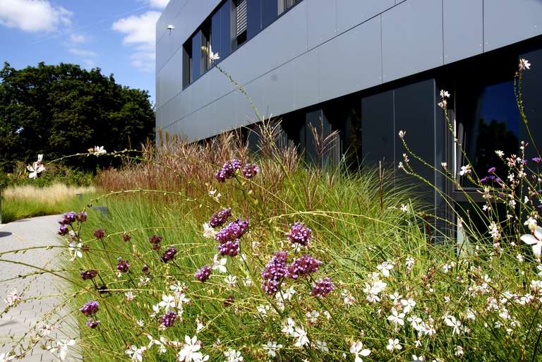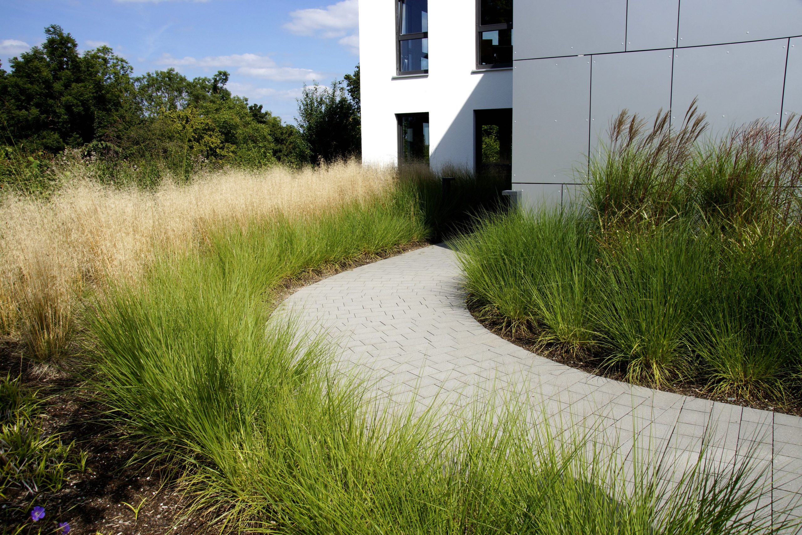 Großflächige Pflanzflächen mit Solitärgräsern in Kulissenpflanzung erzeugen einen repräsentativen Charakter.
