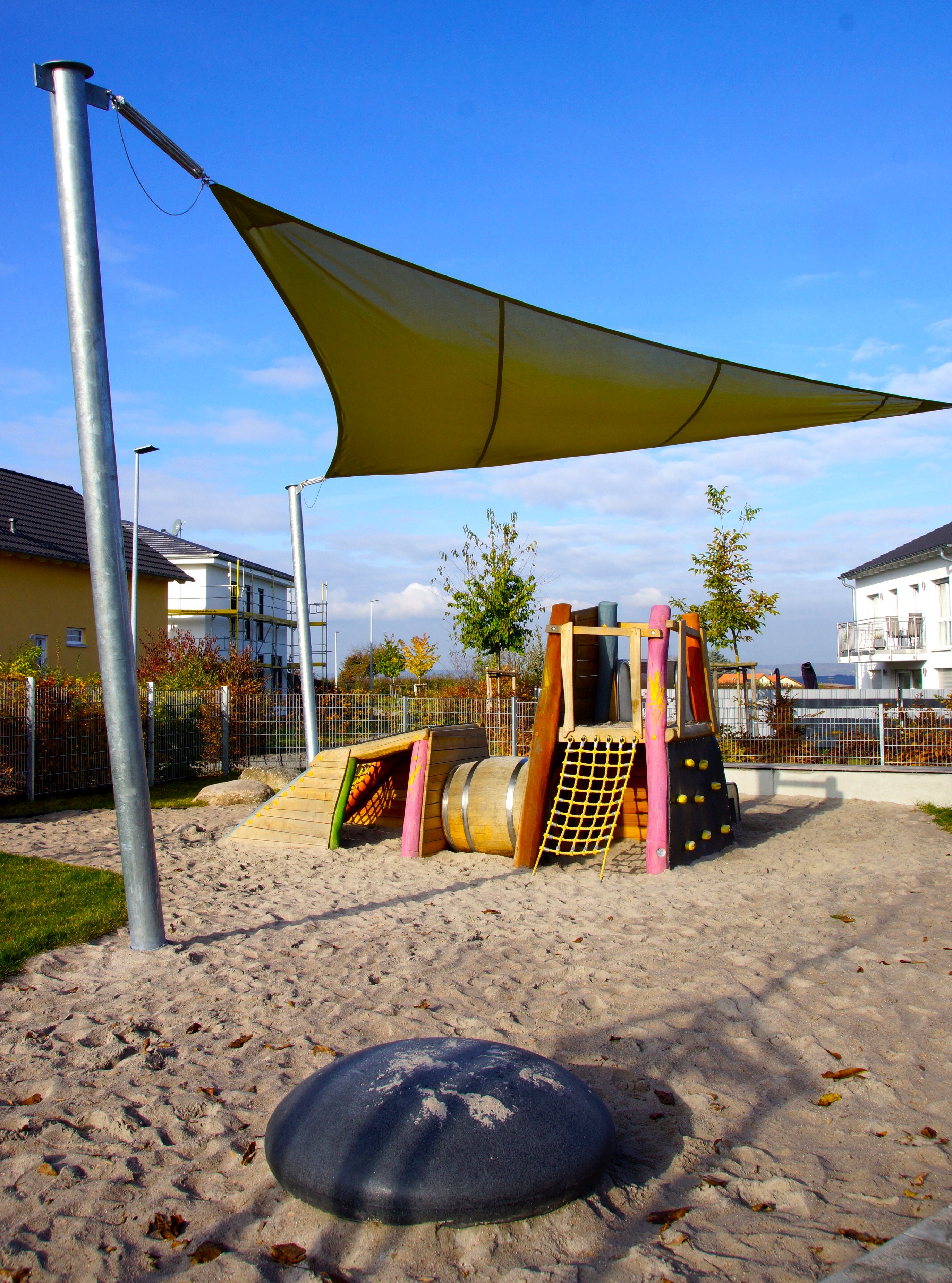 Ein großes raumbildendes Sonnensegel überspannt, beschattet und schützt den Kleinkinderbereich.