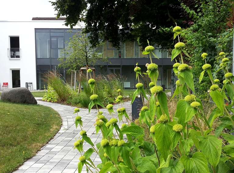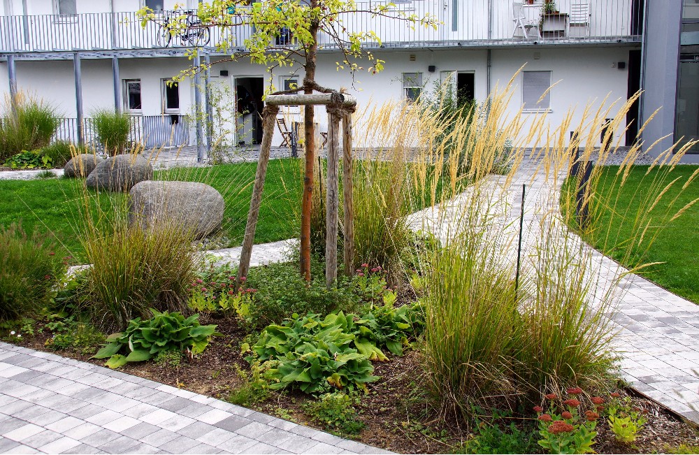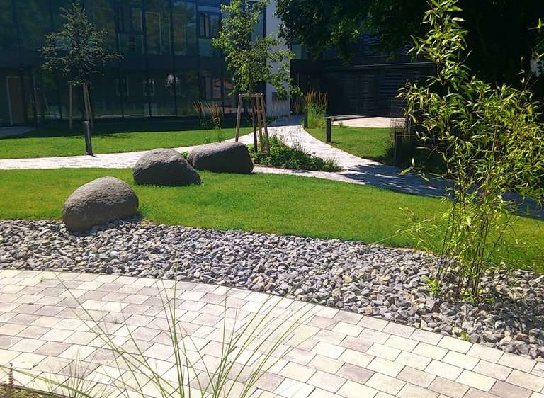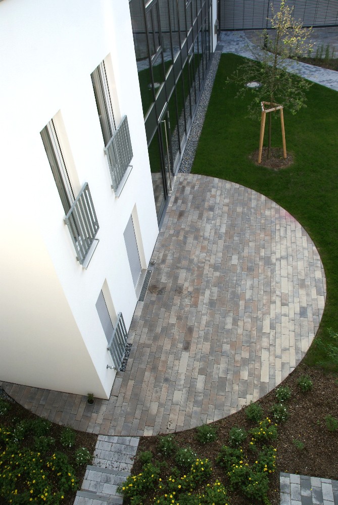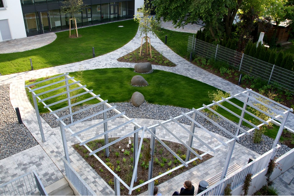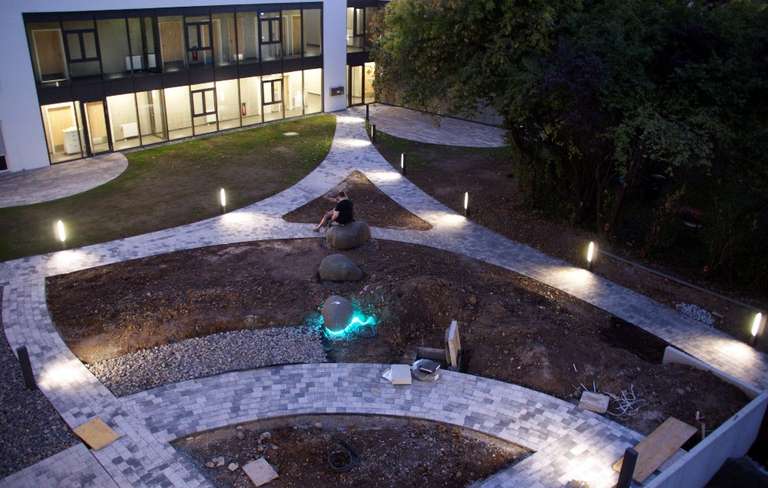 Im Zentrum des Innenhofes mit geschwungenen Wegen sitzen Naturstein-Findlinge – einzigartig wie jeder Mensch und bilden doch eine Einheit – so wie auch die Gesellschaft die Individuen zusammenhält.