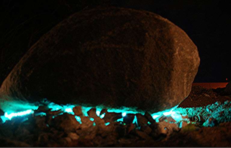 Mit Anbruch der Dämmerung tauchen dezent leuchtende LED-Bänder die Findlinge in ein geheimnisvolles Licht und lassen diese förmlich „schweben“.