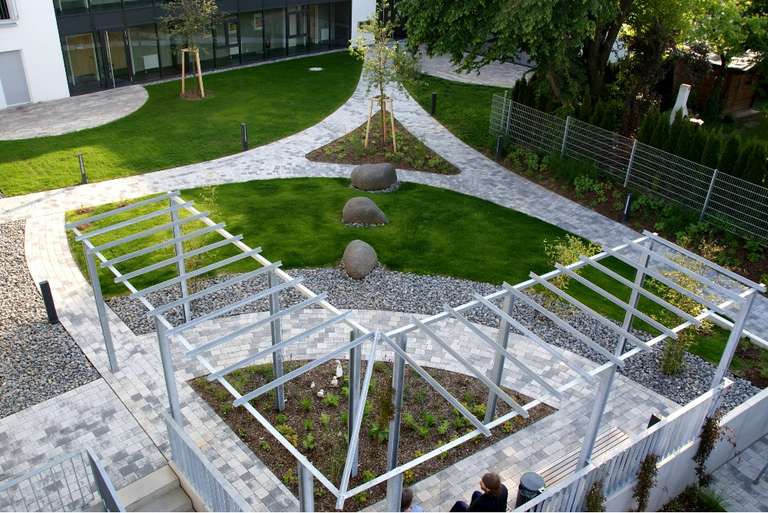 Am nördlichen Gelände-Versprung laden Sitzbänke unter einer luftigen, mit Waldreben berankten Stahlpergola zum Verweilen ein. Zier-Apfelbäume erfreuen mit prachtvollem Blütenschmuck, goldgelber Herbstfärbung und leuchtend orangerote Früchten. Bronze- und Schwarzhalm-Bambus wiegen sich elegant im Wind. Staudenbeete mit Solitär-Gräsern bringen über den ganzen Jahresverlauf vielfältige Formen und Farben hervor. Die Natur wird in Ihrer ganzen Fülle erlebbar und wirkt wie eine wohltuende Oase in dem eher industriell geprägten Umfeld.