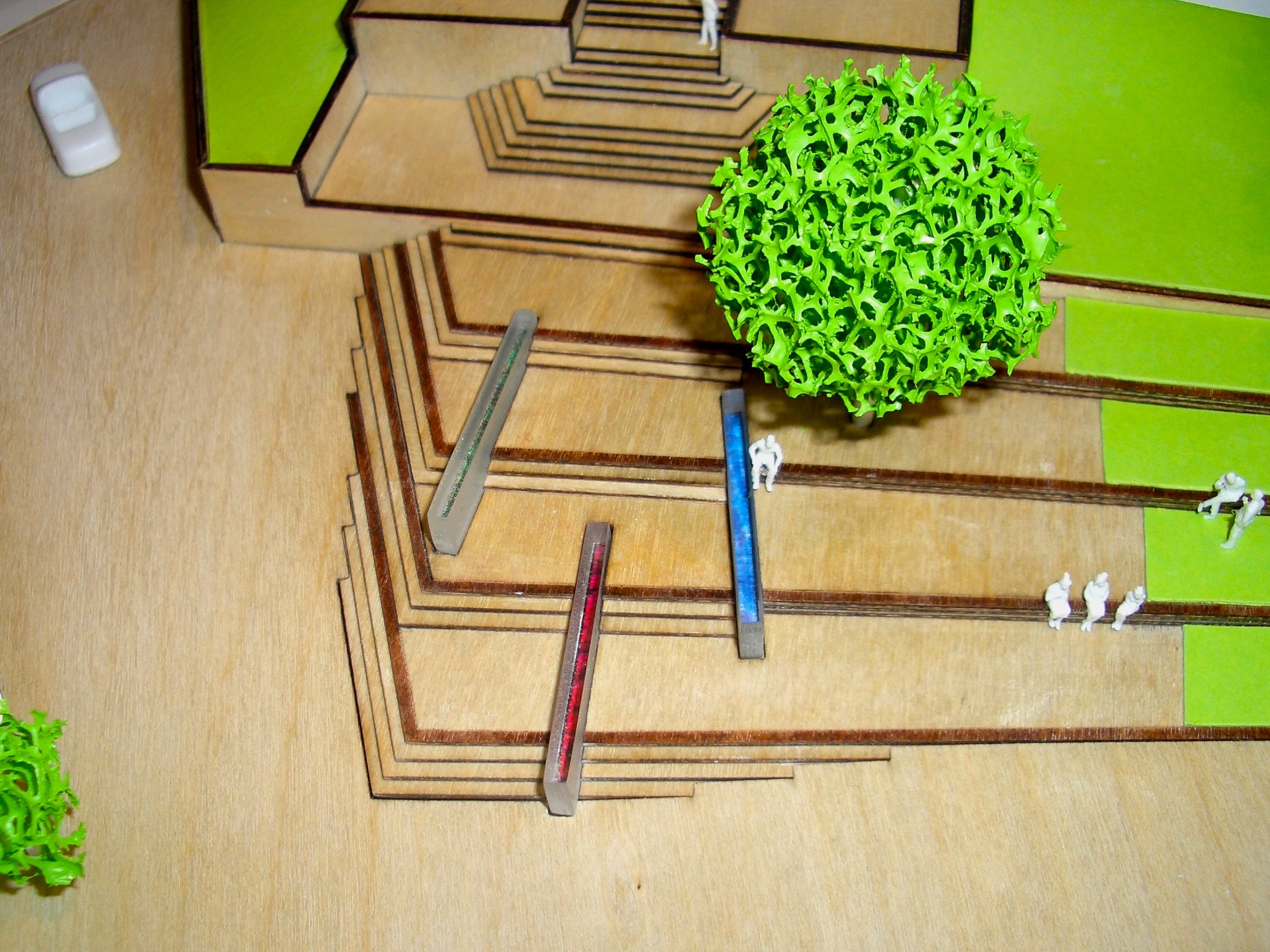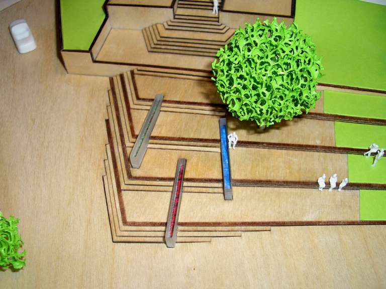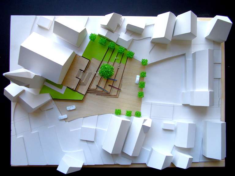 Einzelne fächerförmig gestaffelte Schollen geben dem Platz eine dynamische Drehung und vermitteln zwischen der Ausrichtung der Kirchenfassade und der unteren Raumkante.