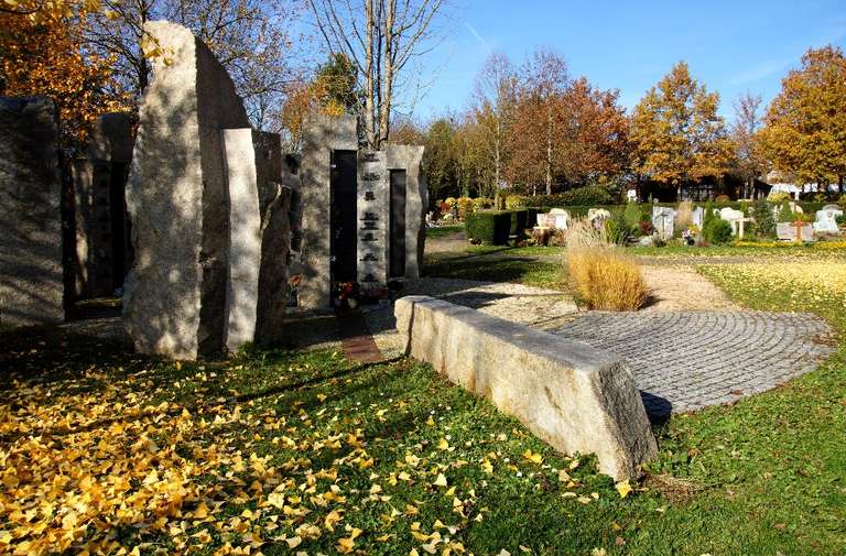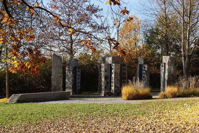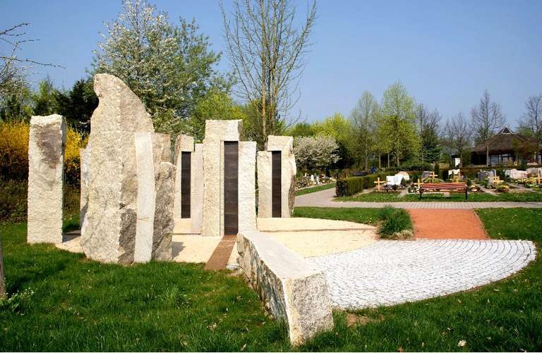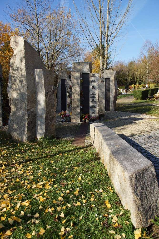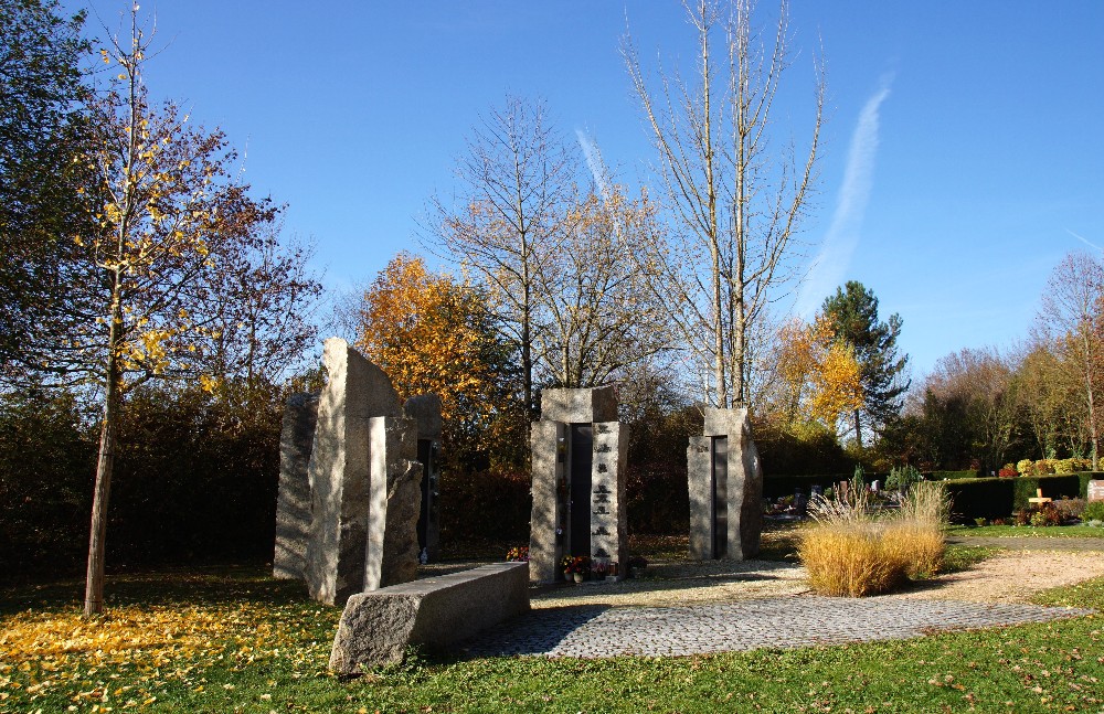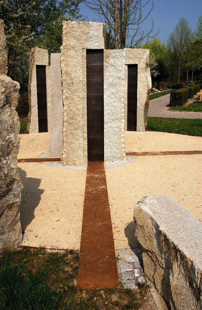Einzel-Stelen aus Epprechtstein-Granit aus dem Fichtelgebirge umsäumen eine runde Platzfläche in deren Mittelpunkt eine Vierfach-Stele steht. Belagsbündig verlegte, Platten-Streifen aus unbehandeltem Schwarzstahl sind der Korrosion unterworfen und machen die Vergänglichkeit greifbar.
