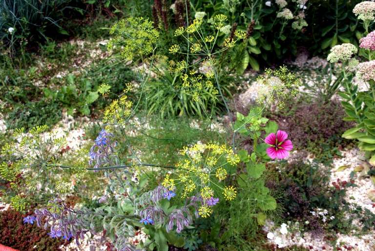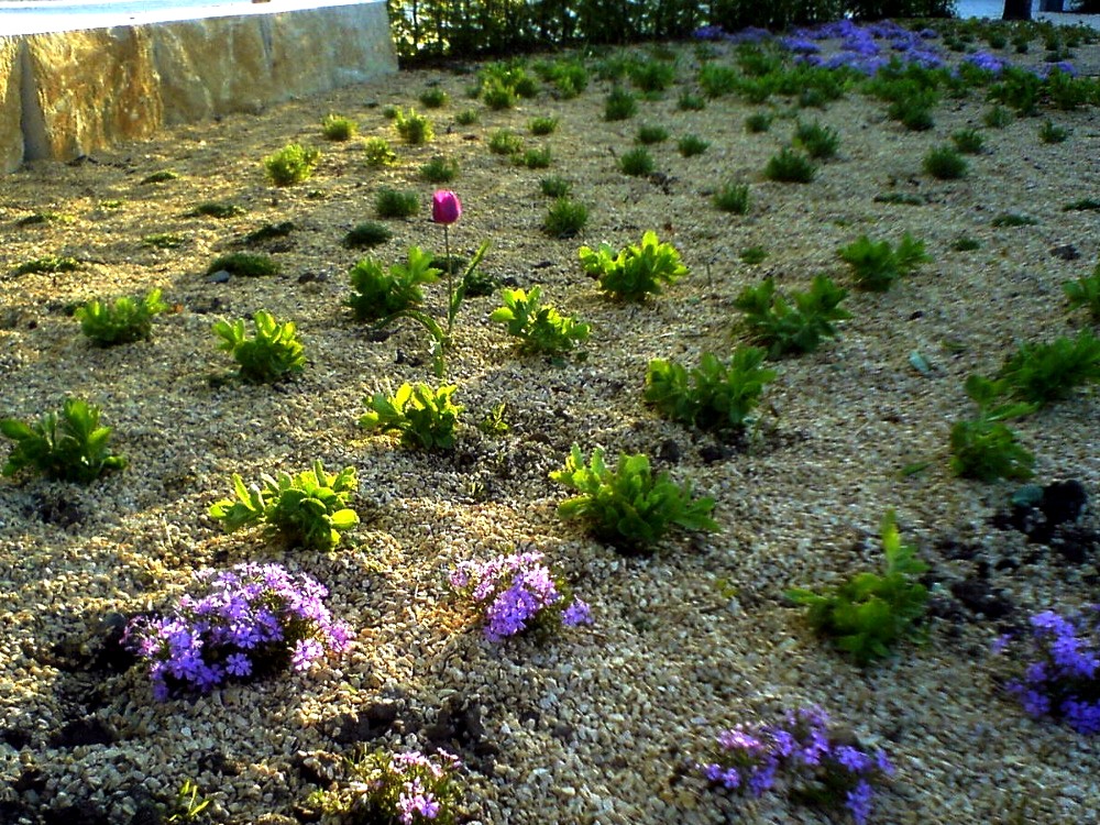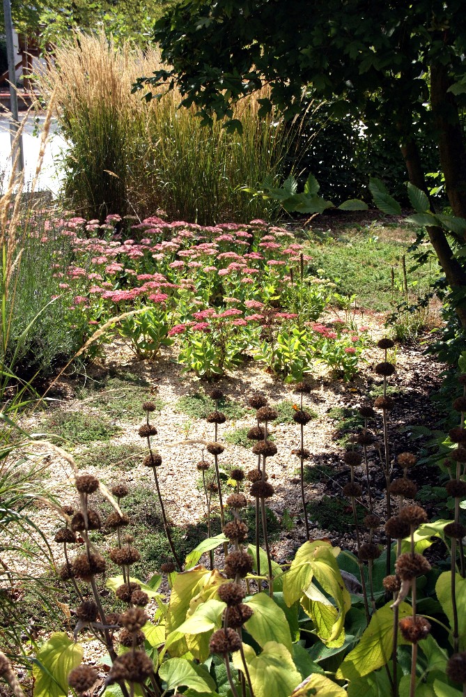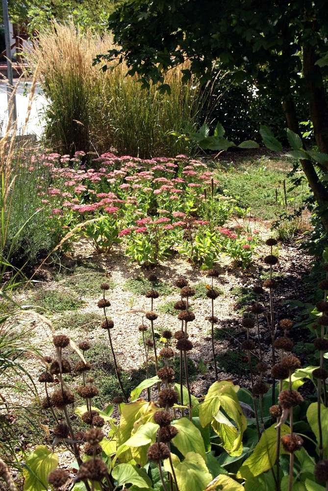 Am Kunstraum entstand ein grünes Klassenzimmer mit halbkreisförmig verlegten Naturstein-Sitzquadern. Neuanlage der Pflanzflächen mit Schulgarten zu Selbstanbau, Stauden und Gräsern.