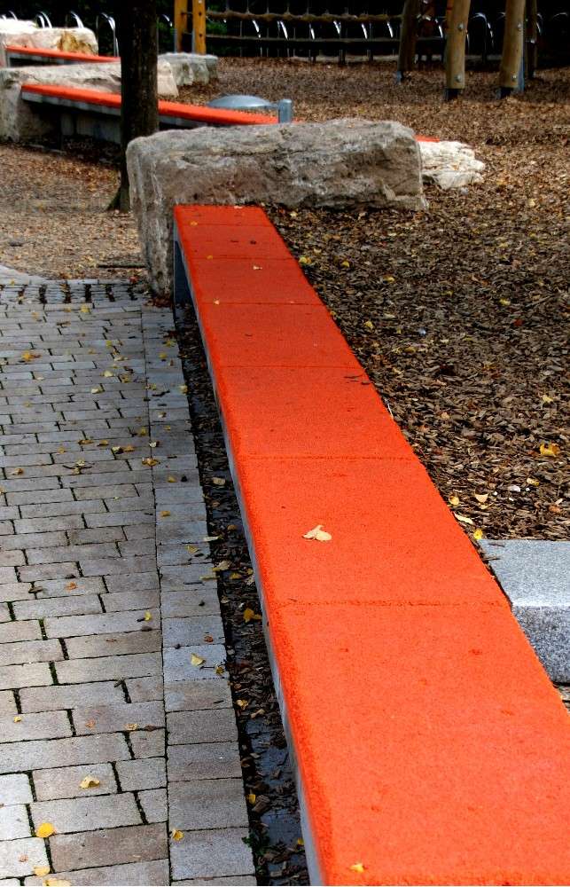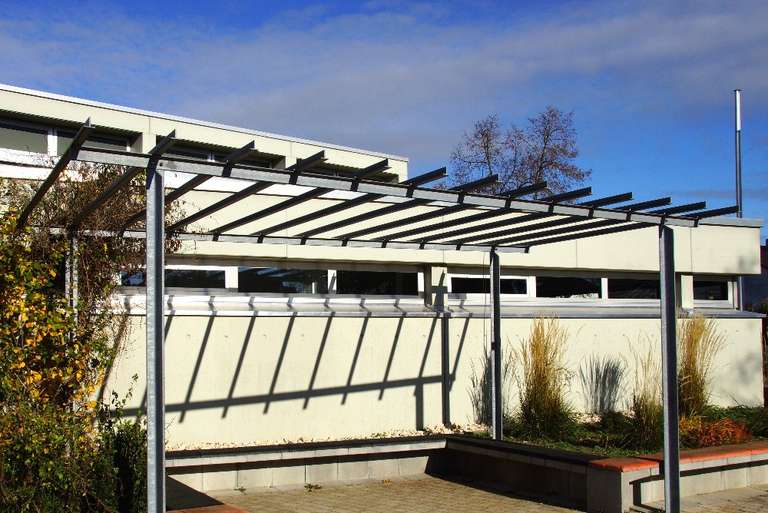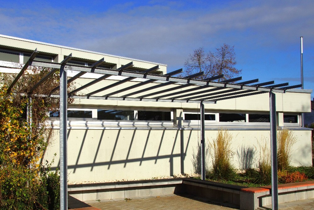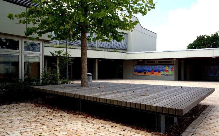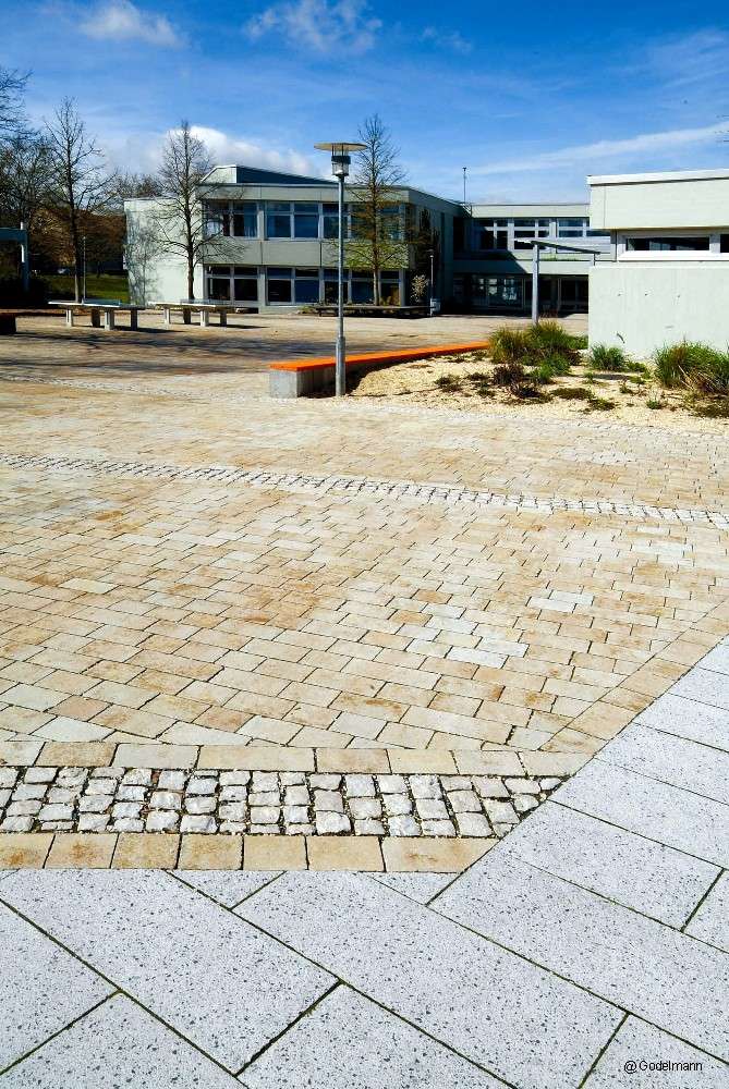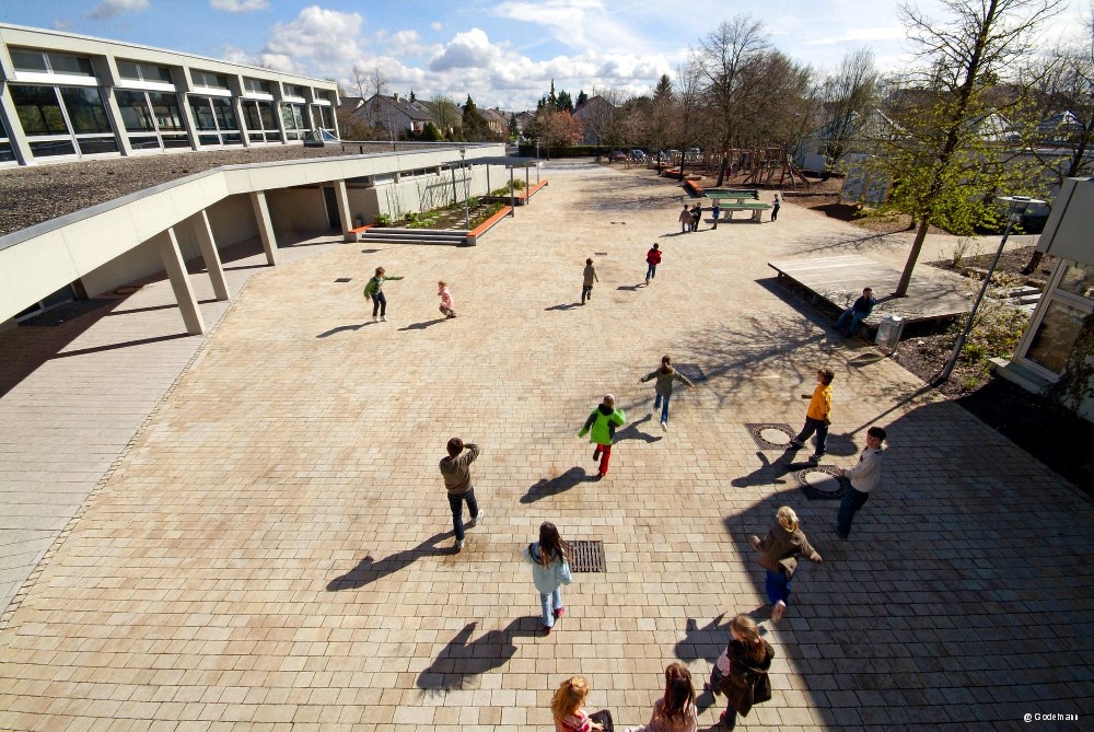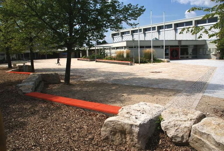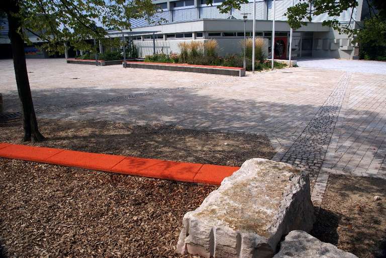 Der Vorplatz der Veranstaltungshalle bekam eine klare Ausrichtung und Naturstein-Sitzquader definierte Eingangszone. Den Übergang zum Schulhof vermitteln strahlenförmig verlegte Natursteinbänder aus Krustenplatten. Eine Aktivzone mit vielgestaltigen Kletter- und Balancierangeboten aus Holz- und Seilspielgeräten fordert zur Bewegung auf. Vorhandene Sitzbereiche wurden ergänzt und mit leuchtend farbigen Fallschutz-Winkelplatten belegt. Eine begrünte Stahl-Pergola bietet ein schattiges Pausenplätzchen. Das Holzdeck kann auch als Bühne für Veranstaltungen genutzt werden.