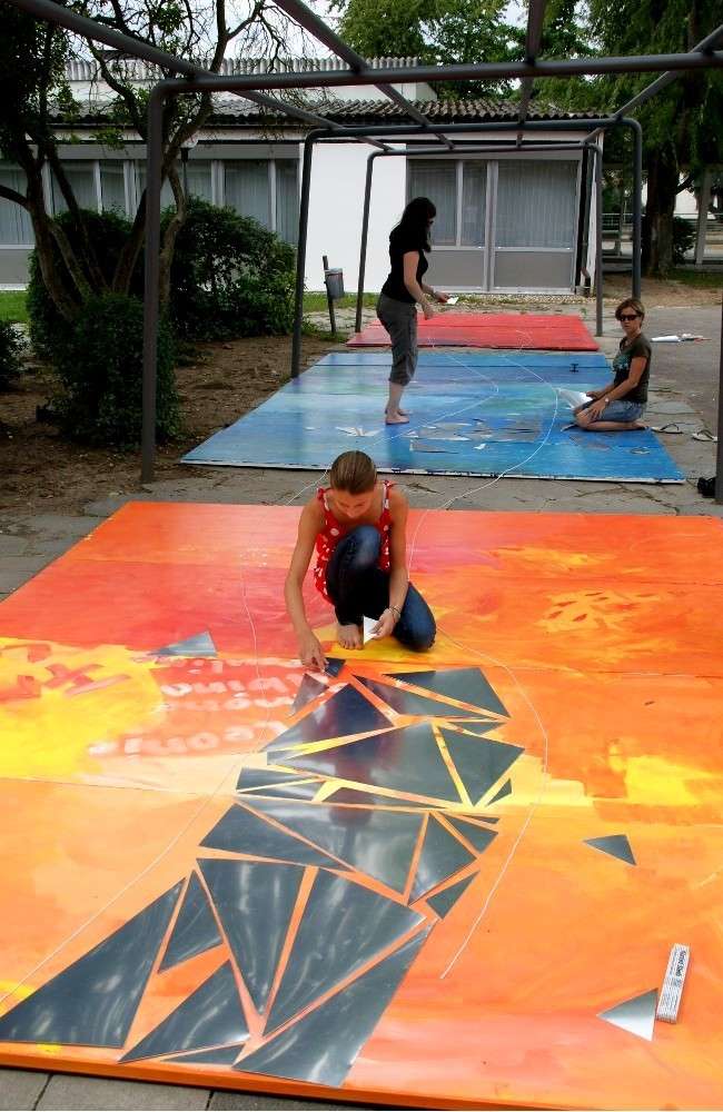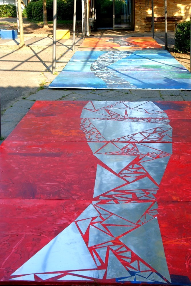 Farbliche Gestaltung der Decken-Platten mit einer Künstlerin unter Beteiligung der Schüler. Sinnliche Erfahrung von Farbe, Form und Raum zur Förderung der kreativen Potenziale und Freude am Gestalten.
