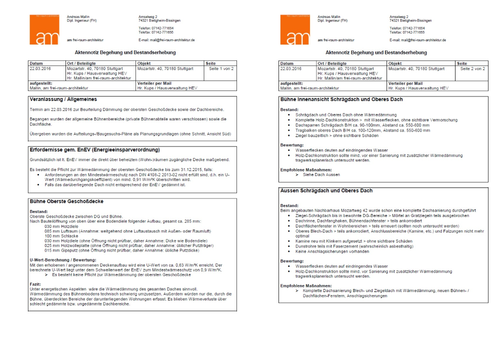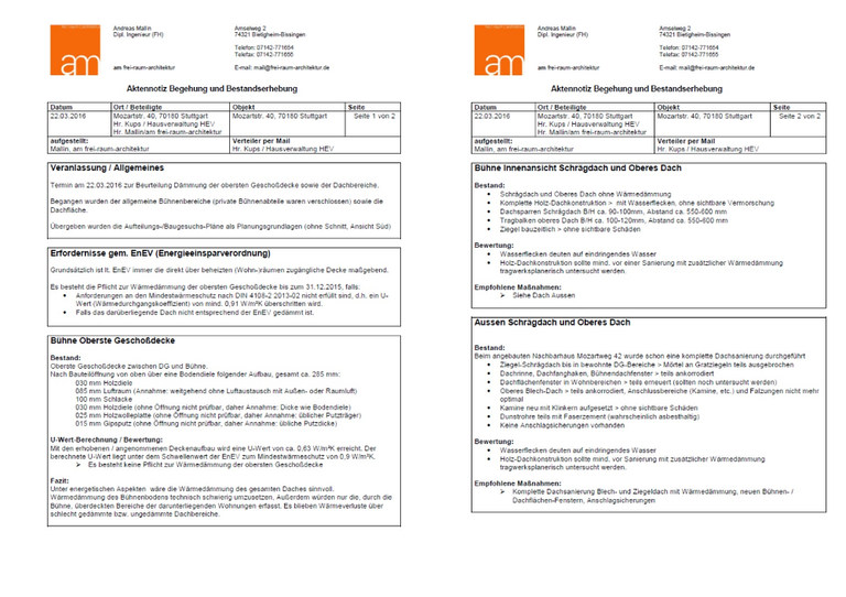 Feststellungen und Beurteilungen zu den Bereichen Dach, Wohnungen, Untergeschoß.