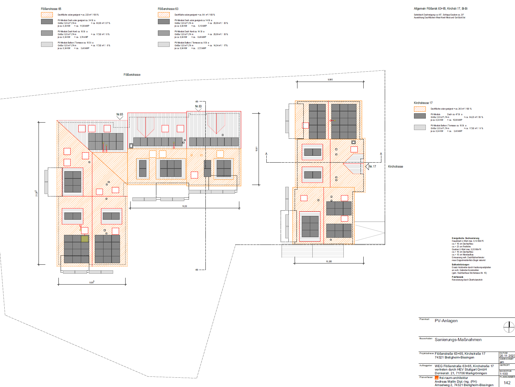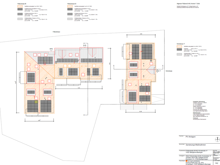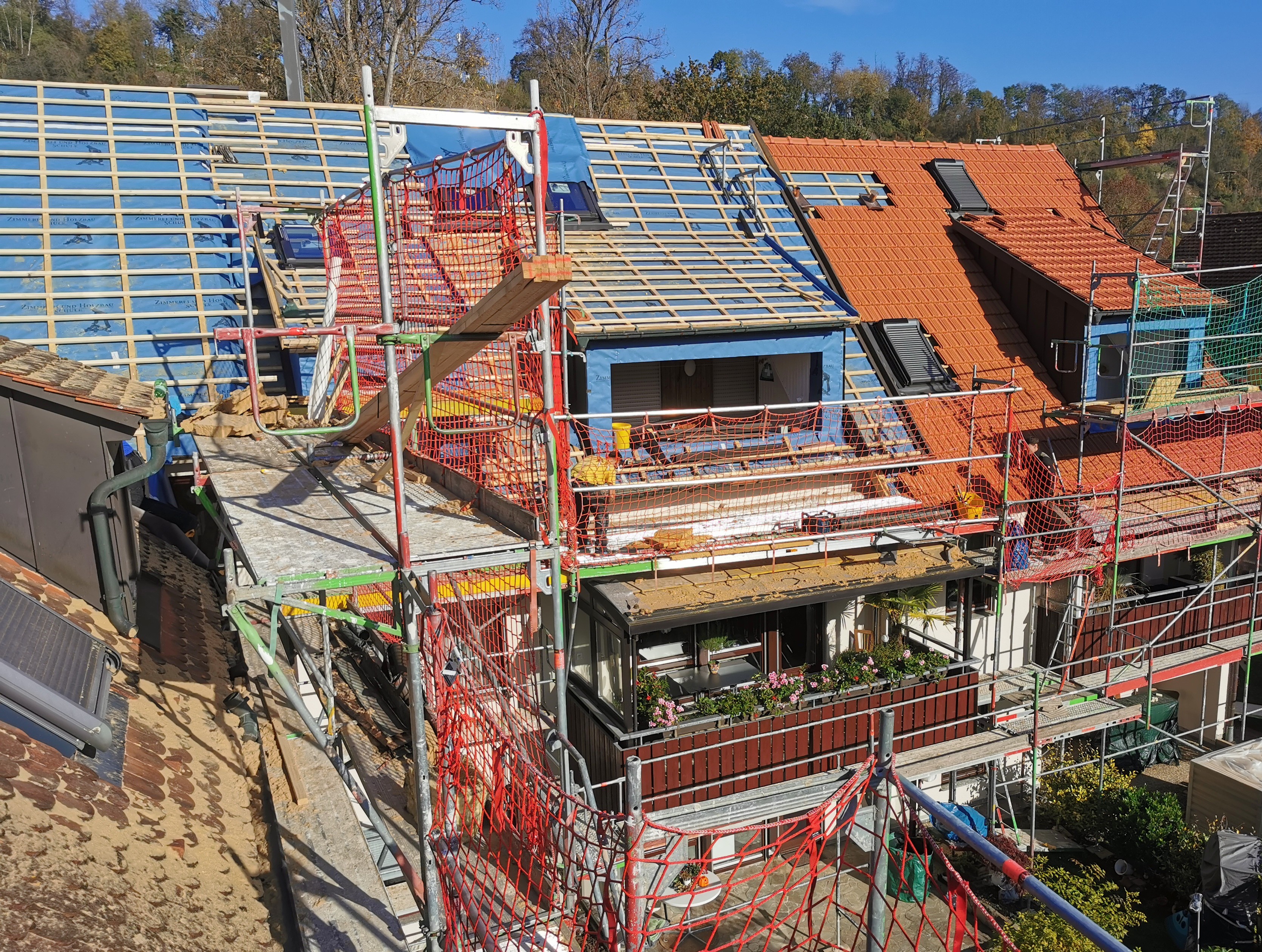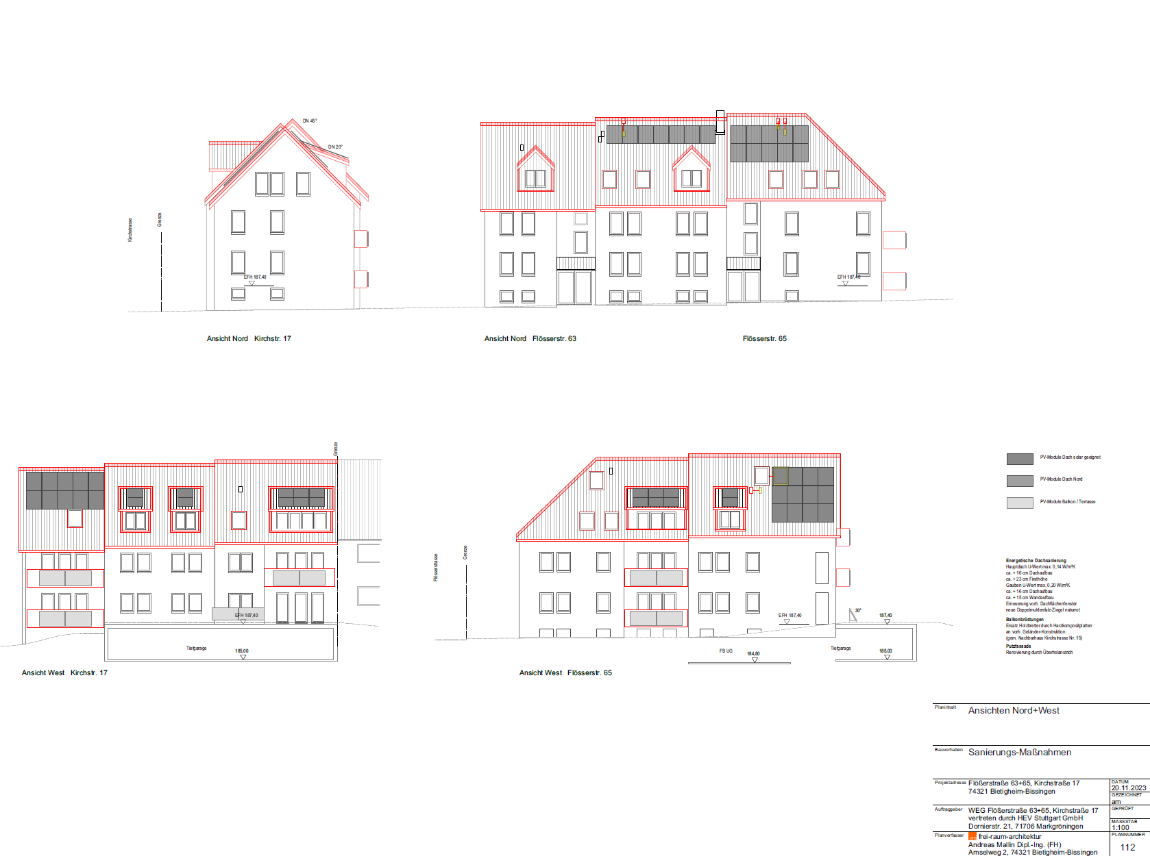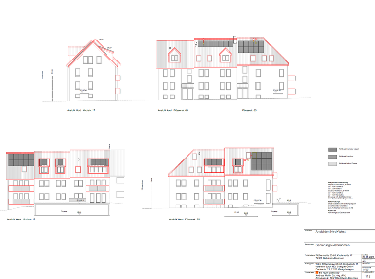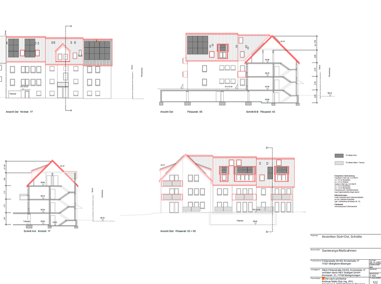 Planungen, Ausschreibungen und Bauüberwachung zu Dach- und Fassaden-Sanierungen von zwei Mehrfamilienhäusern mit Baugesuch zur Einhaltung der Gestaltungssatzung Ortskern Bissingen. Energetische Dachsanierung mit U-Wert-Berechnungen und Förderung energetischer Einzelmaßnahmen nach BEG.