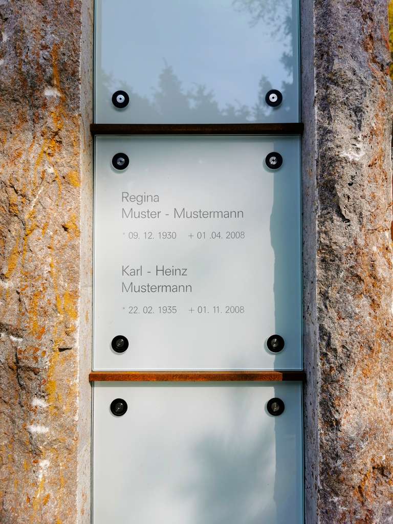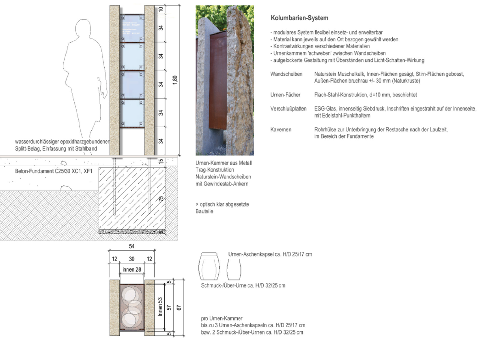 Ein modulares Urnen-System mit Wandscheiben aus Naturstein, Urnen-Fächern aus Stahl und Glas-Verschlußplatten wurde vorgeschlagen.