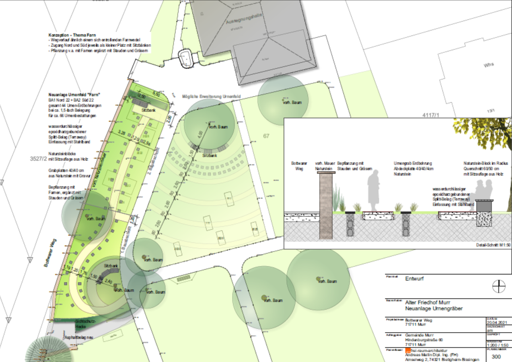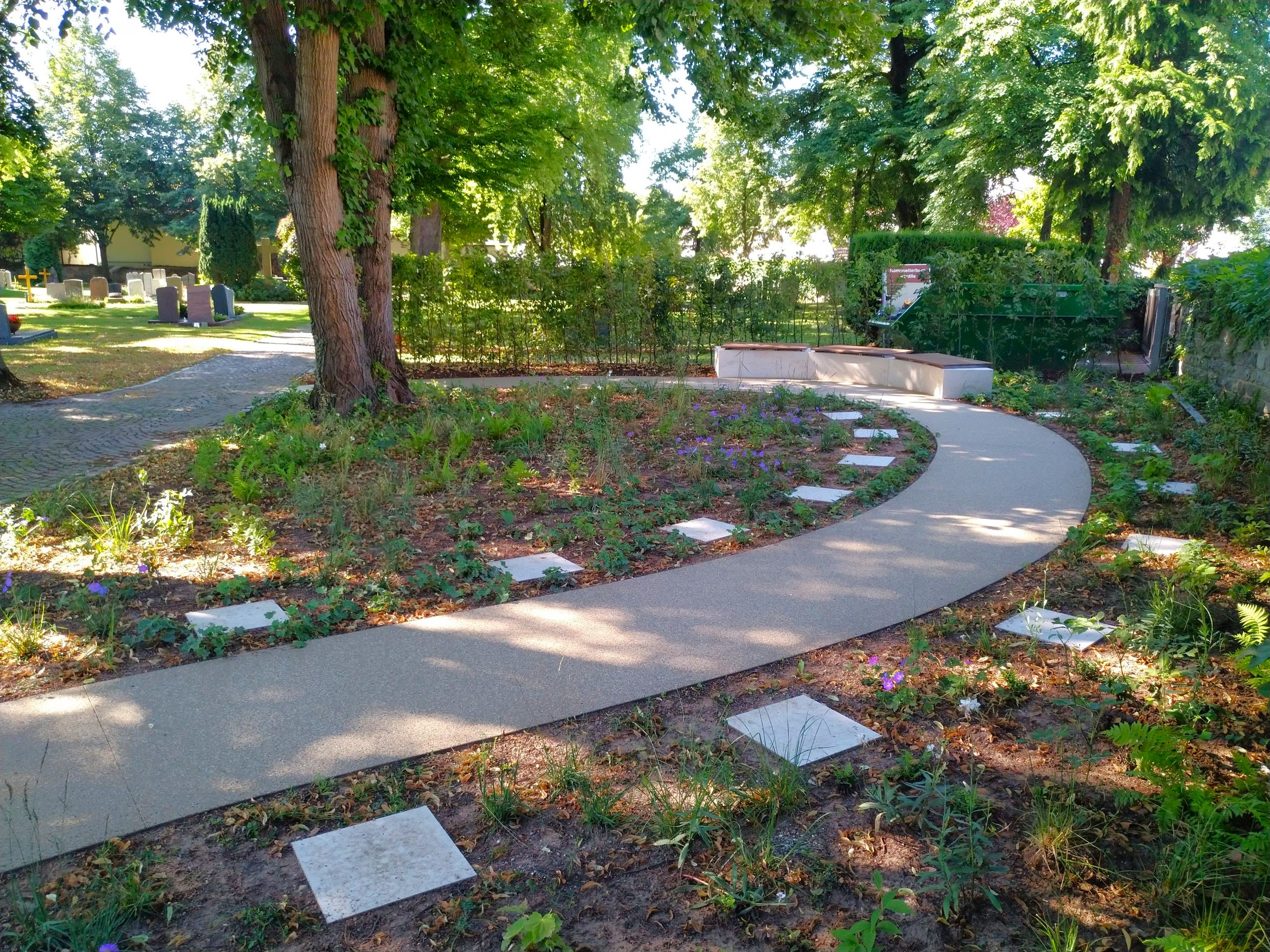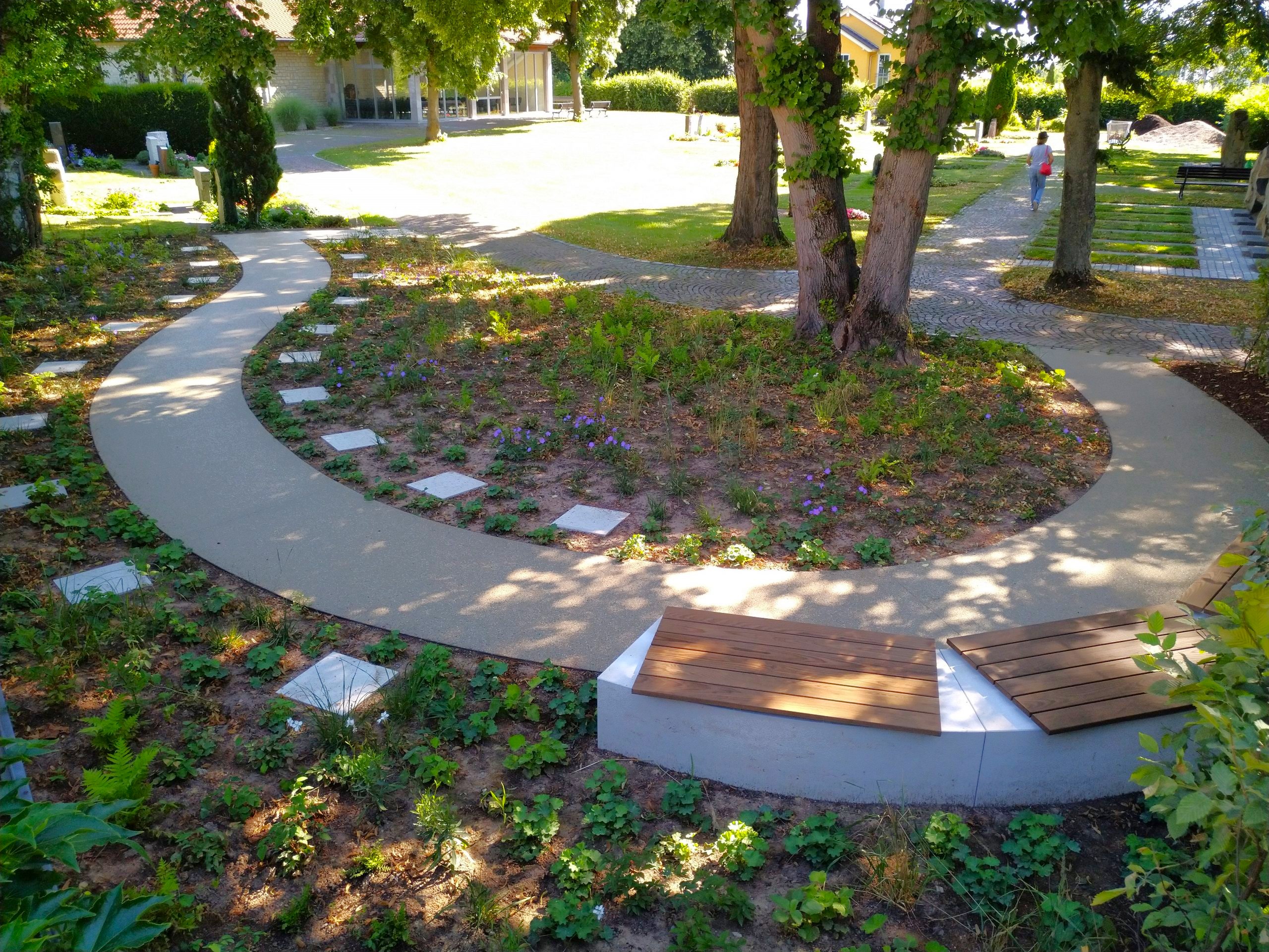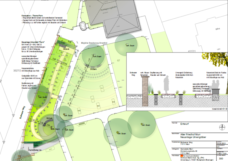 Entlang der Friedhofs-Mauer sollte auf einem langestreckten Bereich ein Grabfeld für Urnen angelegt werden. Als Konzeptions-Idee wurde der Wegverlauf ähnlich einem sich entrollenden Farnwedel angelegt. Entsprechend wurde auch die Pflanzung v.a. mit Farnen ergänzt mit Stauden und Gräsern gewählt.