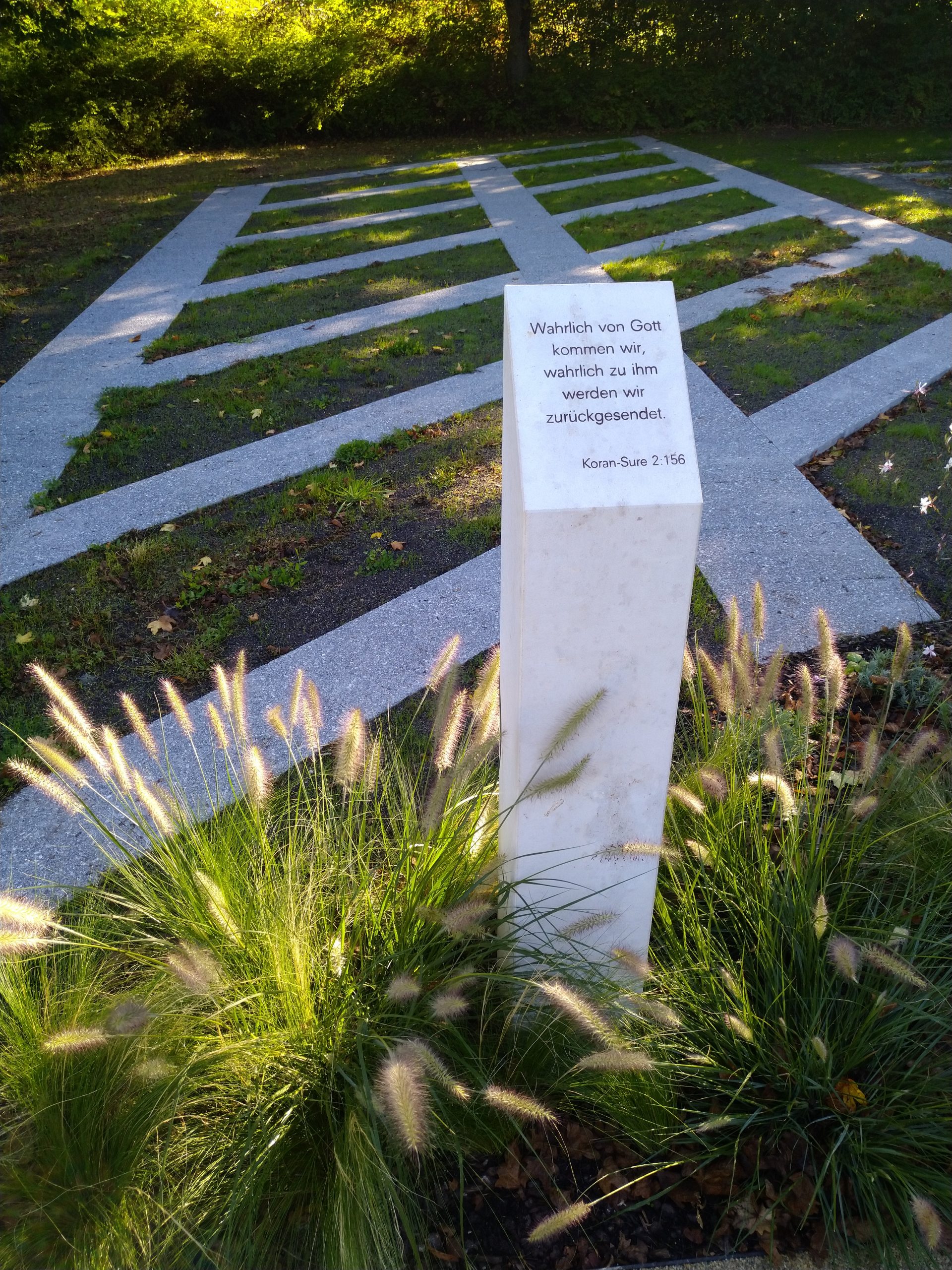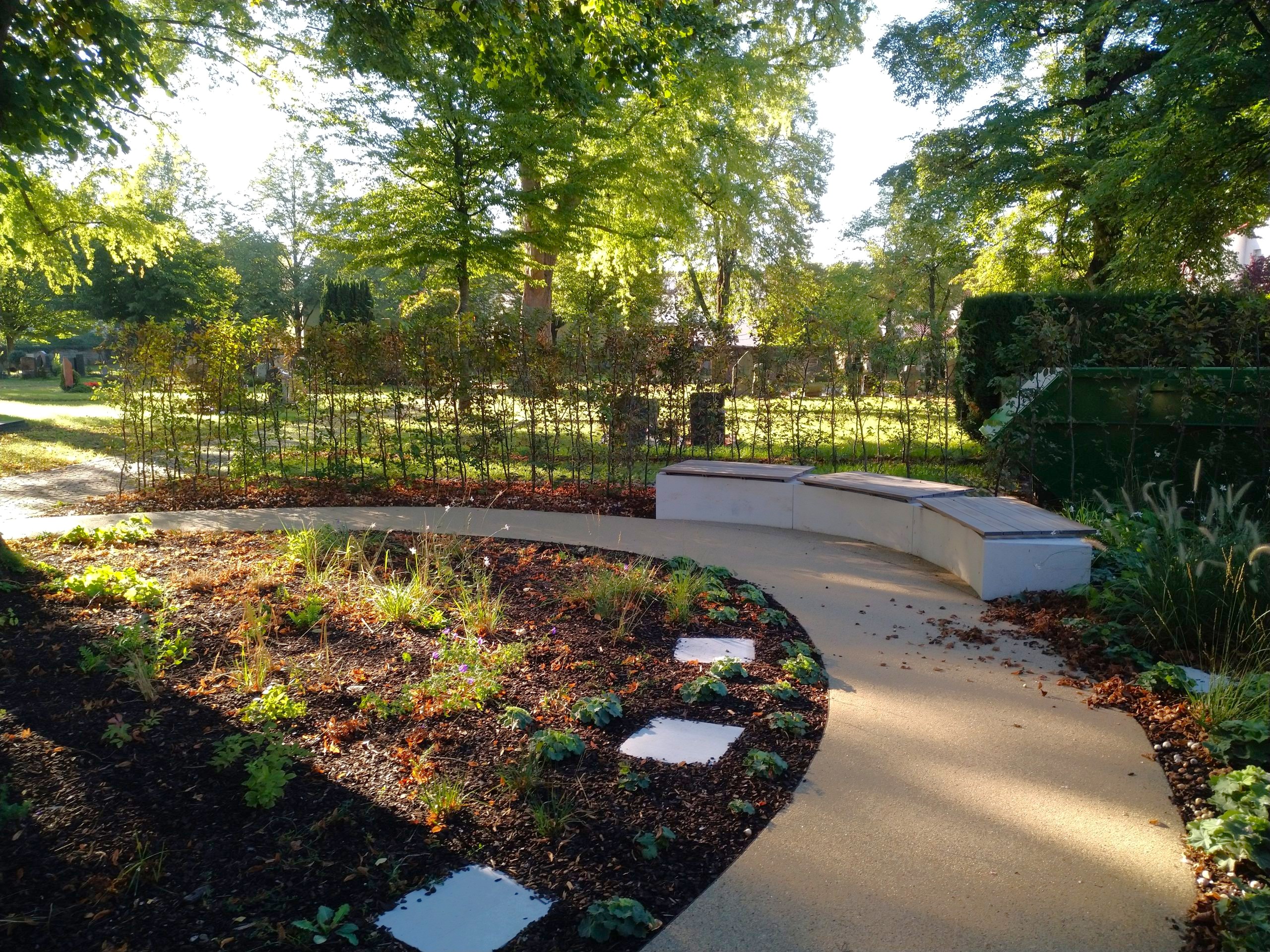 Dem zunehmenden Wunsch nach muslimischen Bestattungen sollte durch ein neues Grabfeld Rechnung getragen werden. Die Grabstellen sind Richtung Mekka ausgerichtet. Als Verbindung zwischen den Kulturen und Religionen wurde ein Platz der Begegnung zu den angrenzenden Grabstätten geschaffen. Die ovale Grundform verbindet beide Bereiche und symbolisiert die Wiedergeburt. Naturstein-Sitzblöcke geben Gelegenheit zum Verweilen und Austausch. Naturstein-Stelen sind jeweils mit Sinnsprüchen aus dem Koran und dem Christentum versehen. Der Platzbelag aus wasserdurchlässigem, gebundenem Splitt-Belag mit Stahl-Einfassungen sowie die Bepflanzung mit Stauden und Gräsern schaffen eine ruhige und freundliche Atmosphäre.