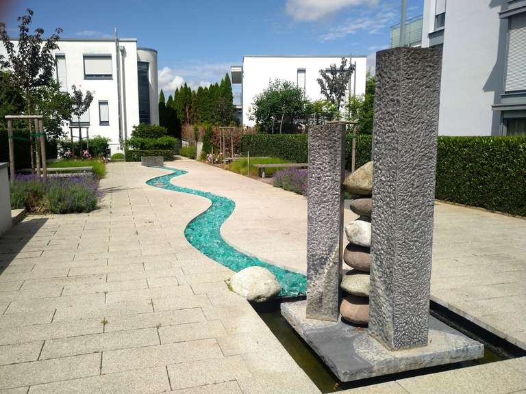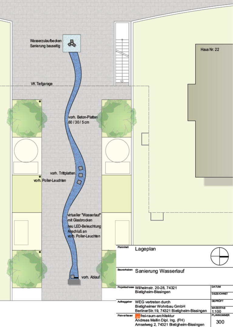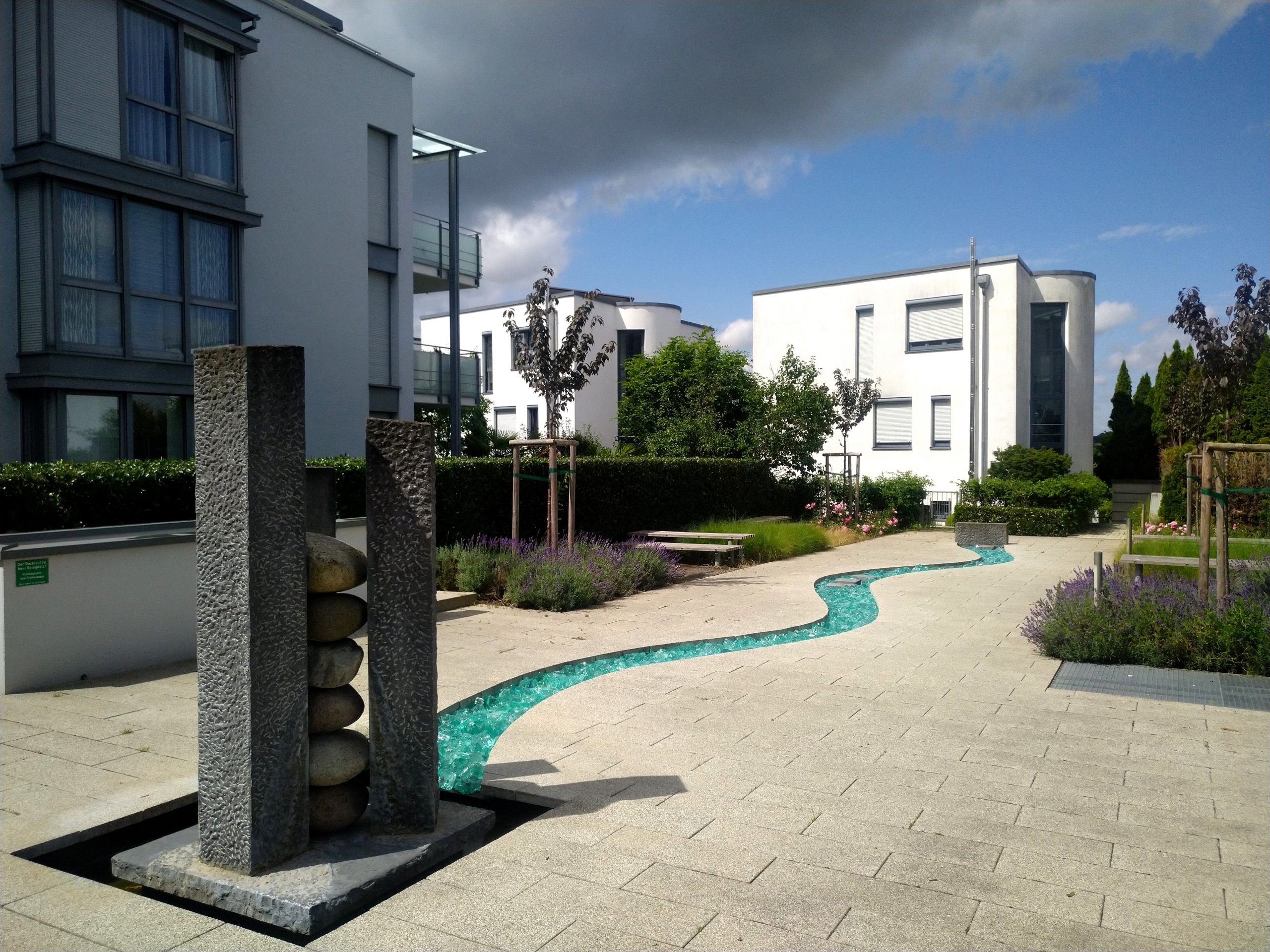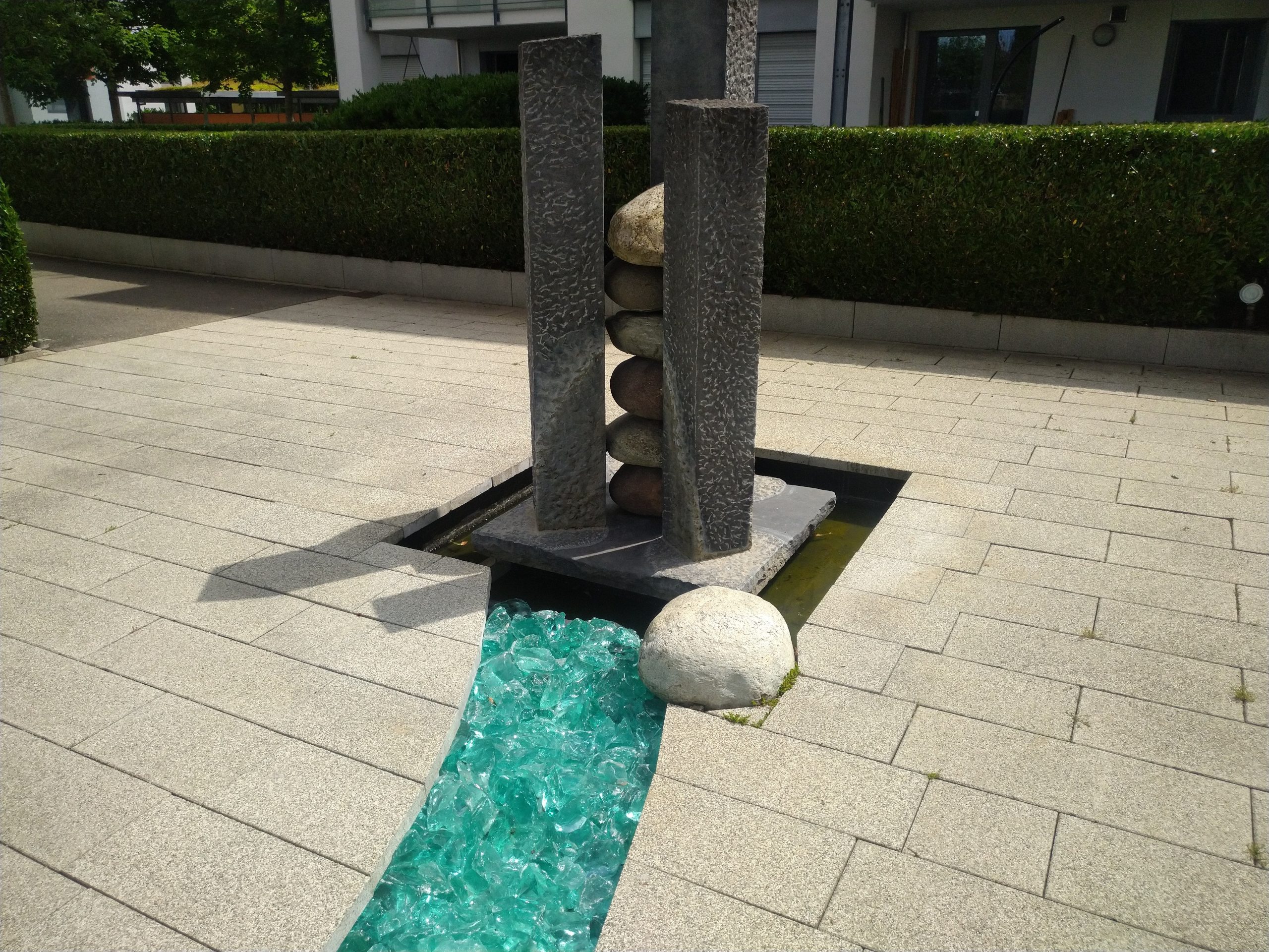 Die vorhandenen Wasser-Stelen aus Naturstein und das Einlaufbecken sollten als bestimmende Elemente erhalten werden.