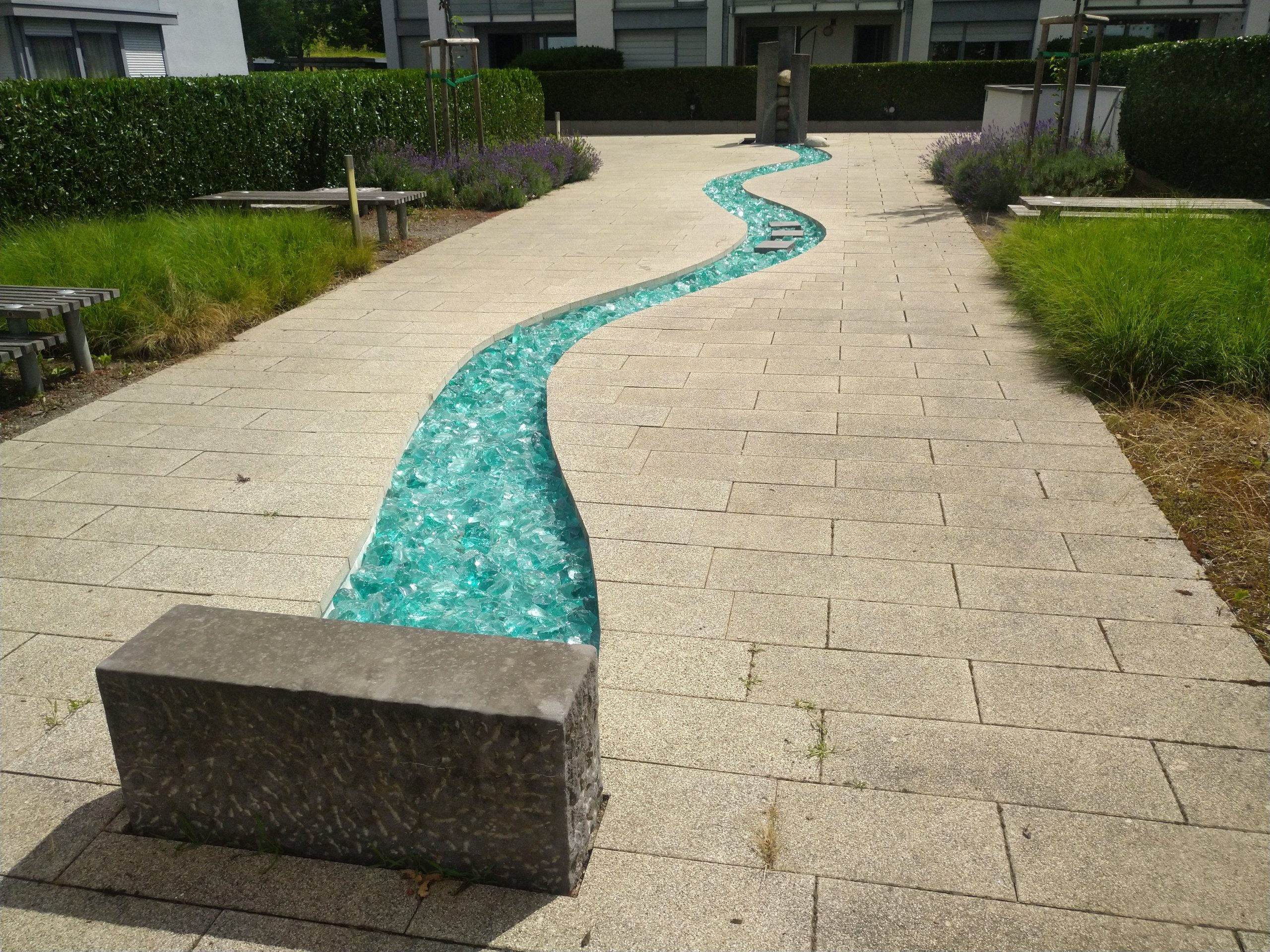 Durchnässte Aufbauschichten wurden entfernt und das Einlaufbecken als Wasserfläche mit PU sicher abgedichtet. Der ehemalige Wasserlauf wurde mit Glas-Schotter verfüllt und erhält eine Effekt-Beleuchtung mit LED-Licht – ein neues Glanzlicht der Wohnanlage.
