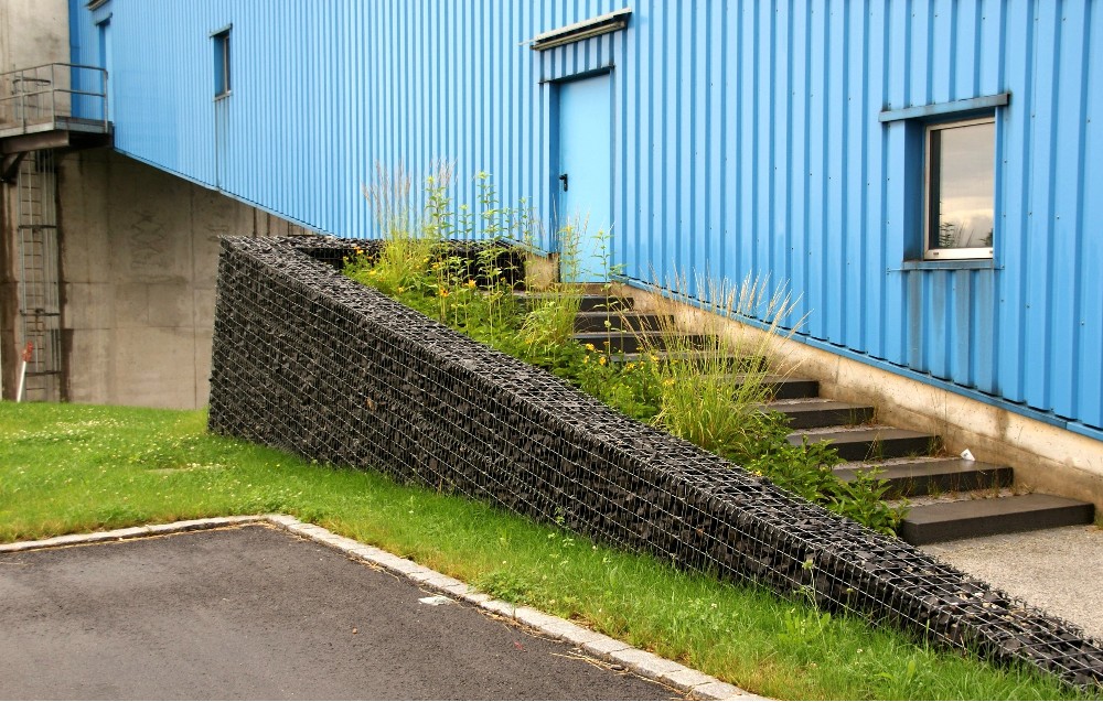 Eine besondere Herausforderung lag darin, das Gebäude harmonisch in den Lärmschutzwall zu integrieren. Die Überdeckung des Gebäudes mit extremer Hangneigung von 45° wurde in enger Abstimmung mit Tragwerksplanung, Bodengutachter, Begrünungsspezialisten geplant und mit speziell rezeptierten Mischungen aus kornabgestuftem Mineral-Substrat-Mörtel-Gemisch sowie Anspritzbegrünung realisiert.