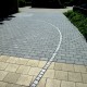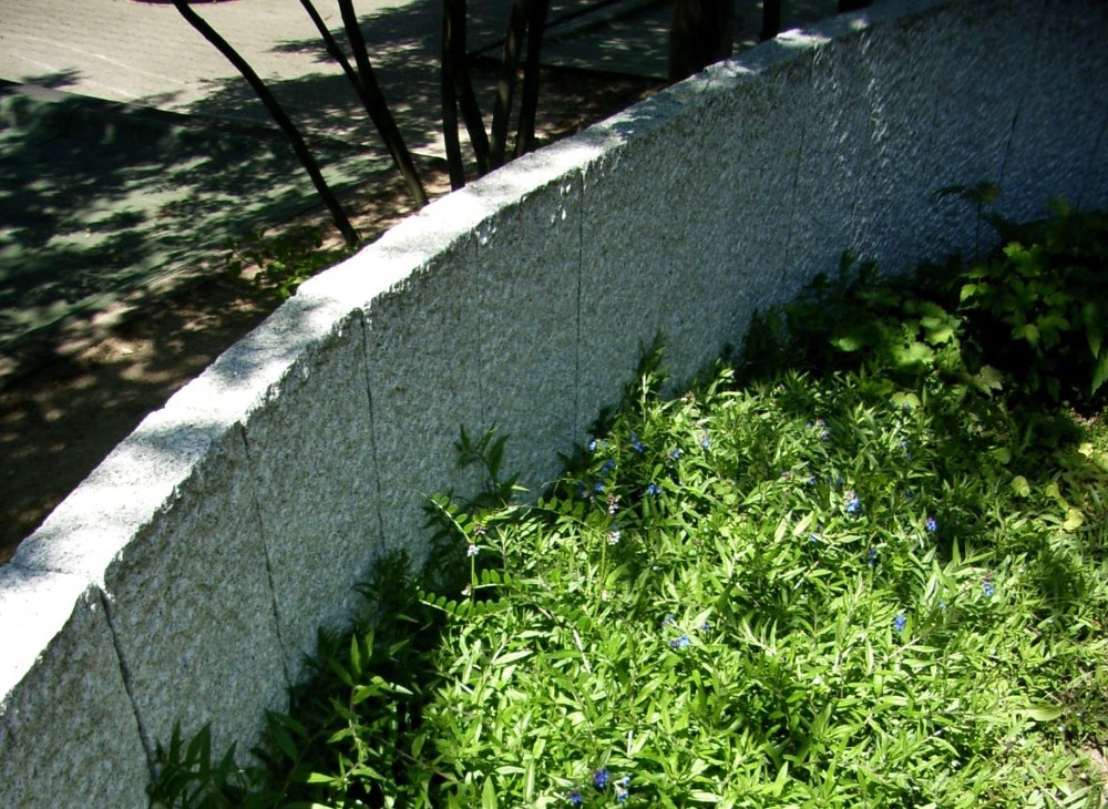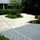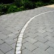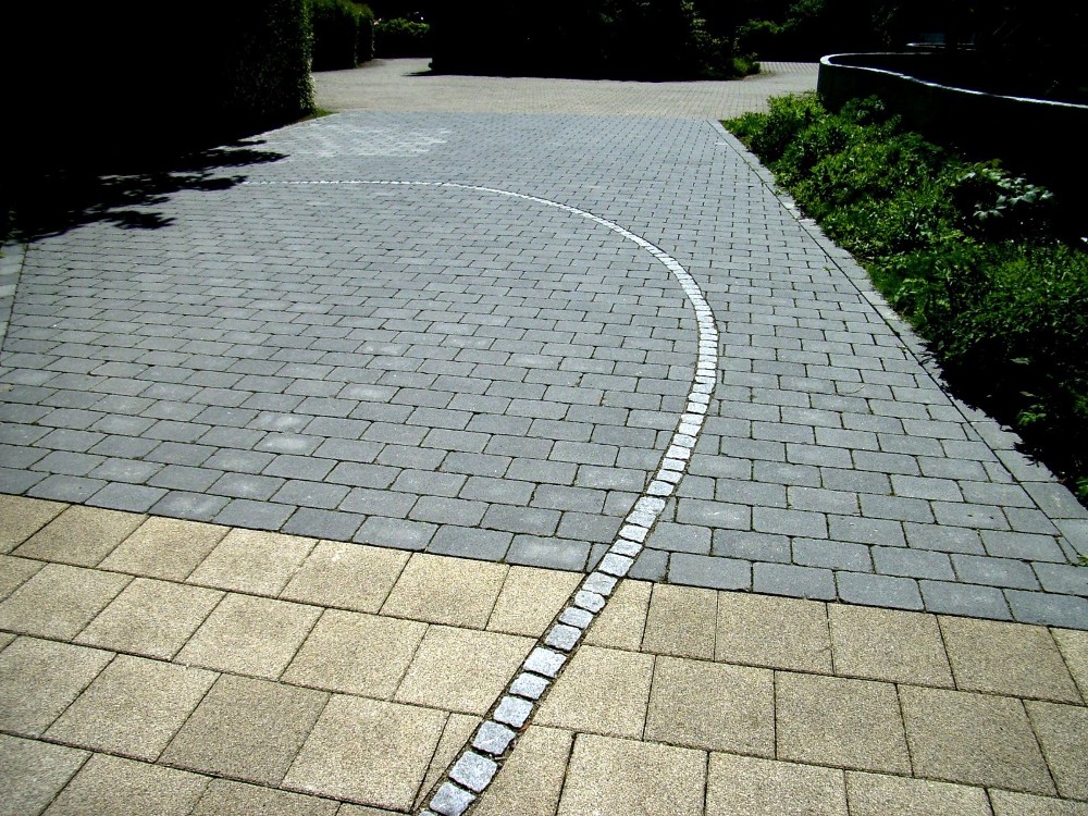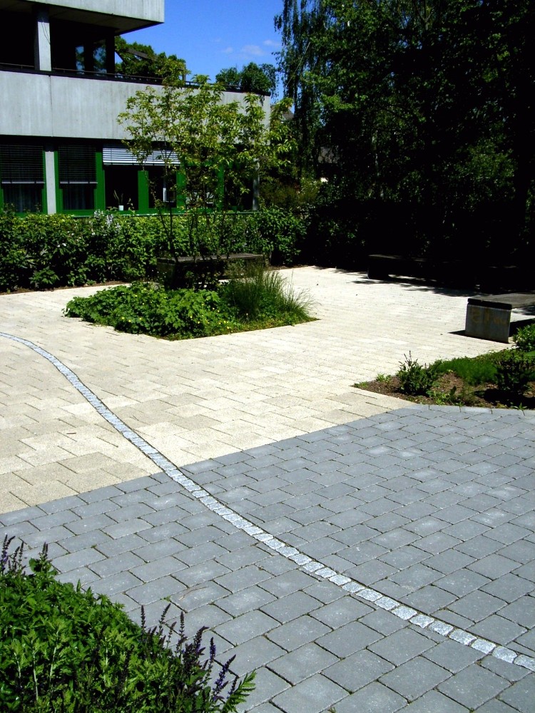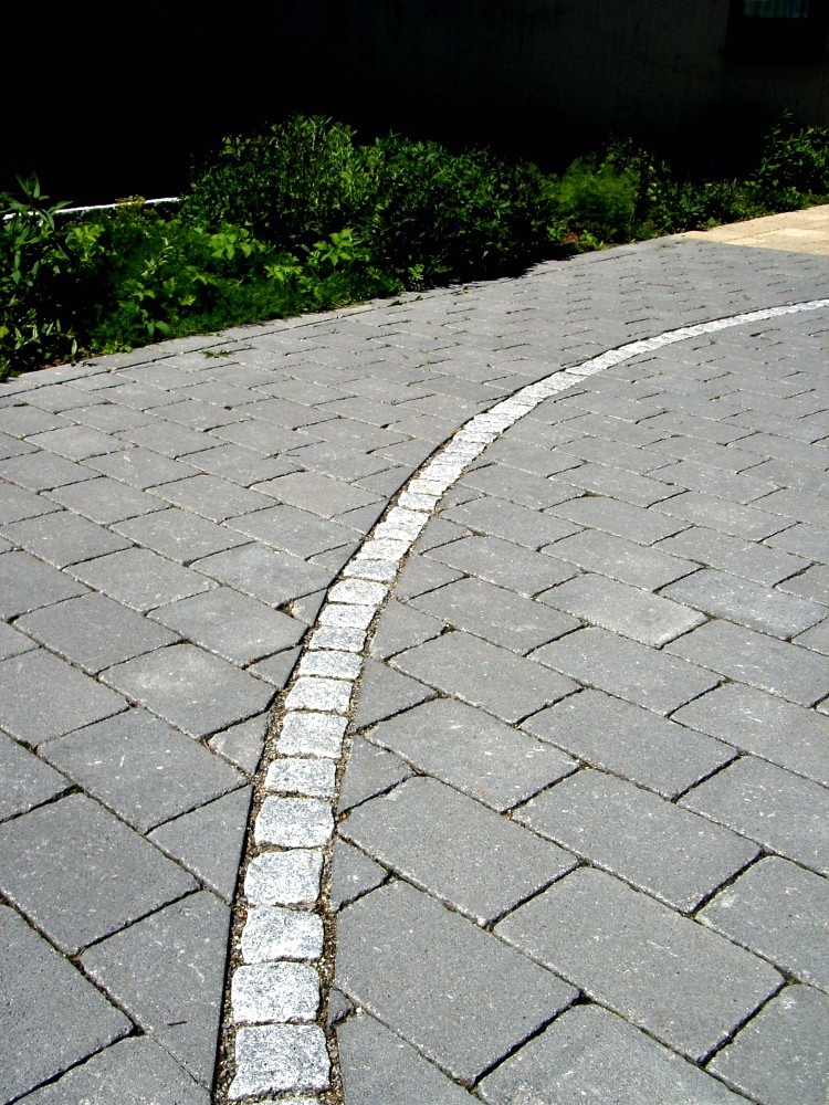 Spannende Kontraste durch fließende Bogenformen der Mauer und unterschiedliche Beläge mit Pflasterlinie.