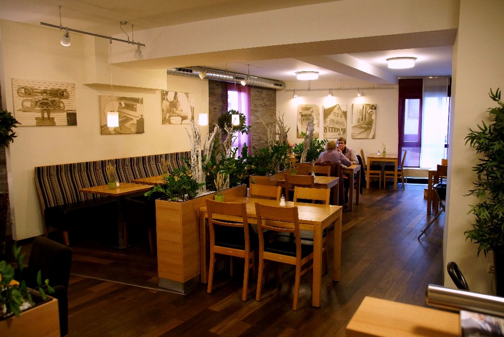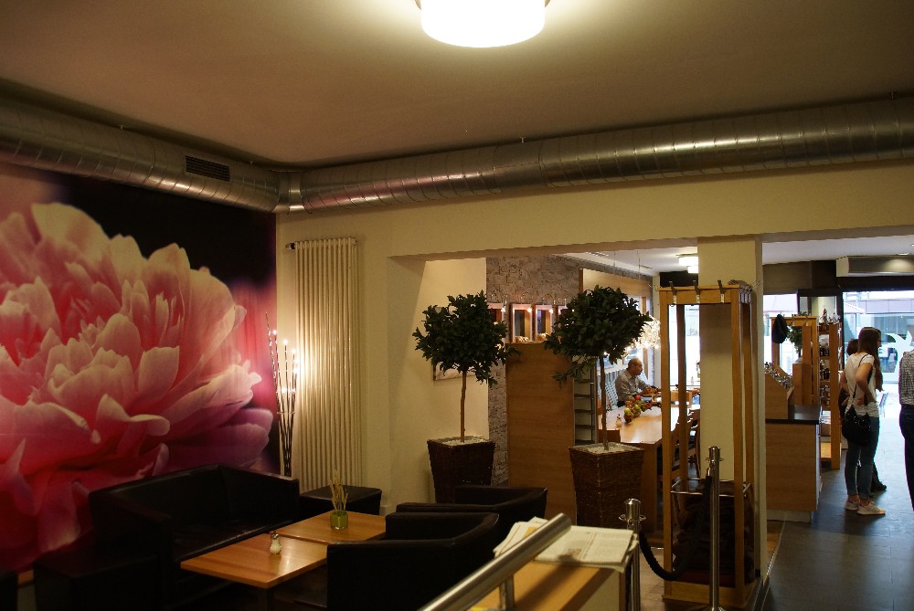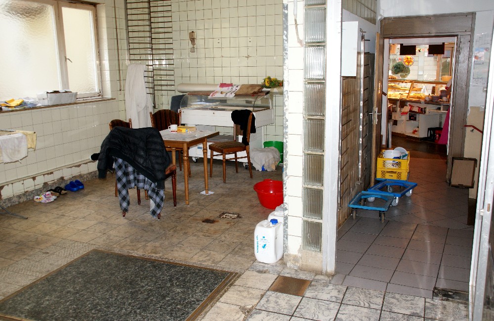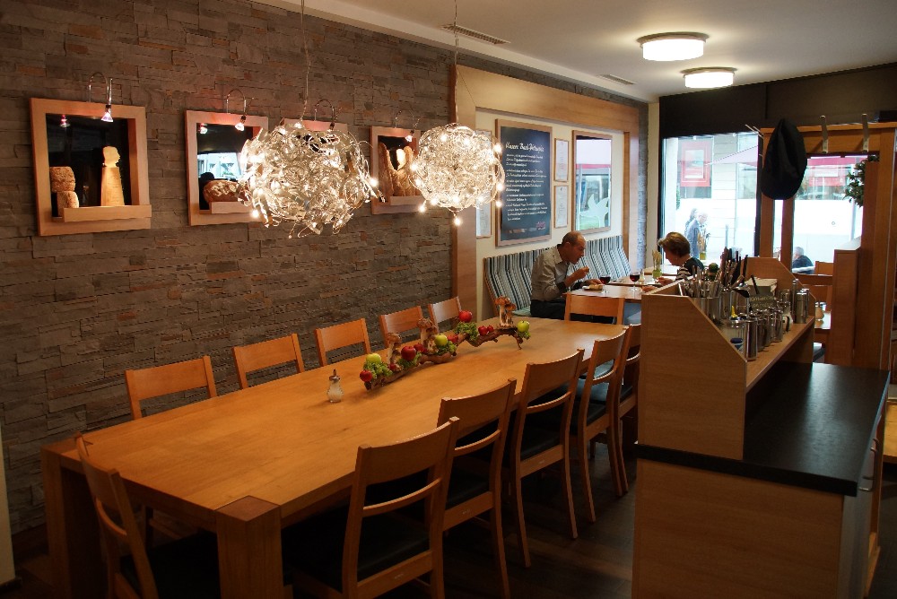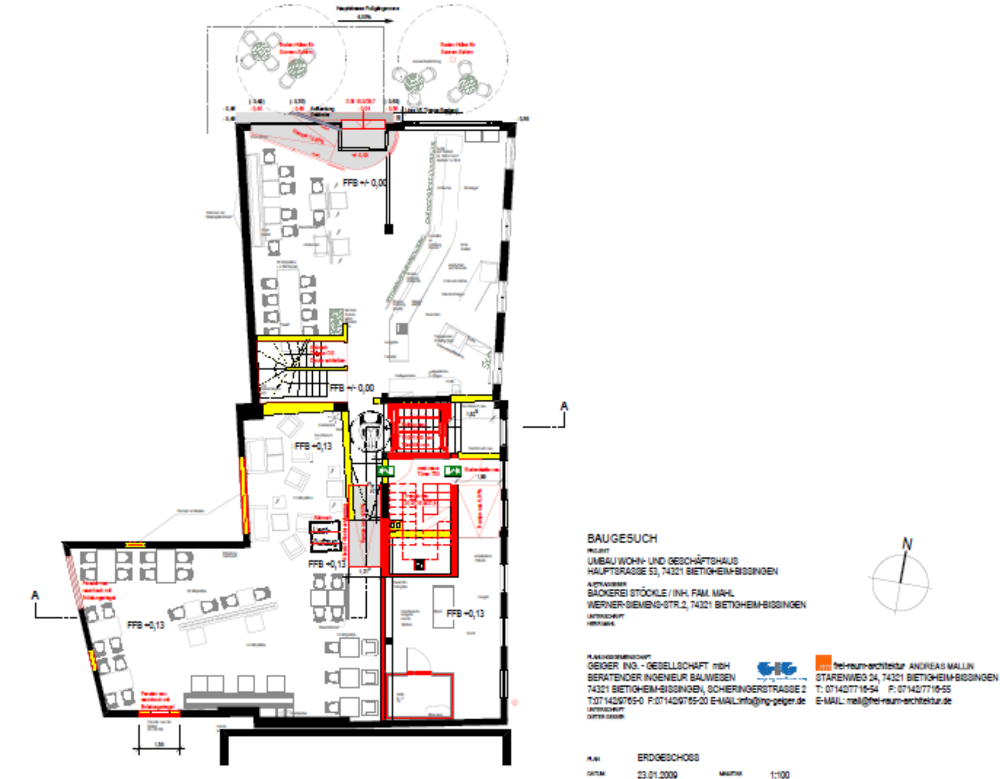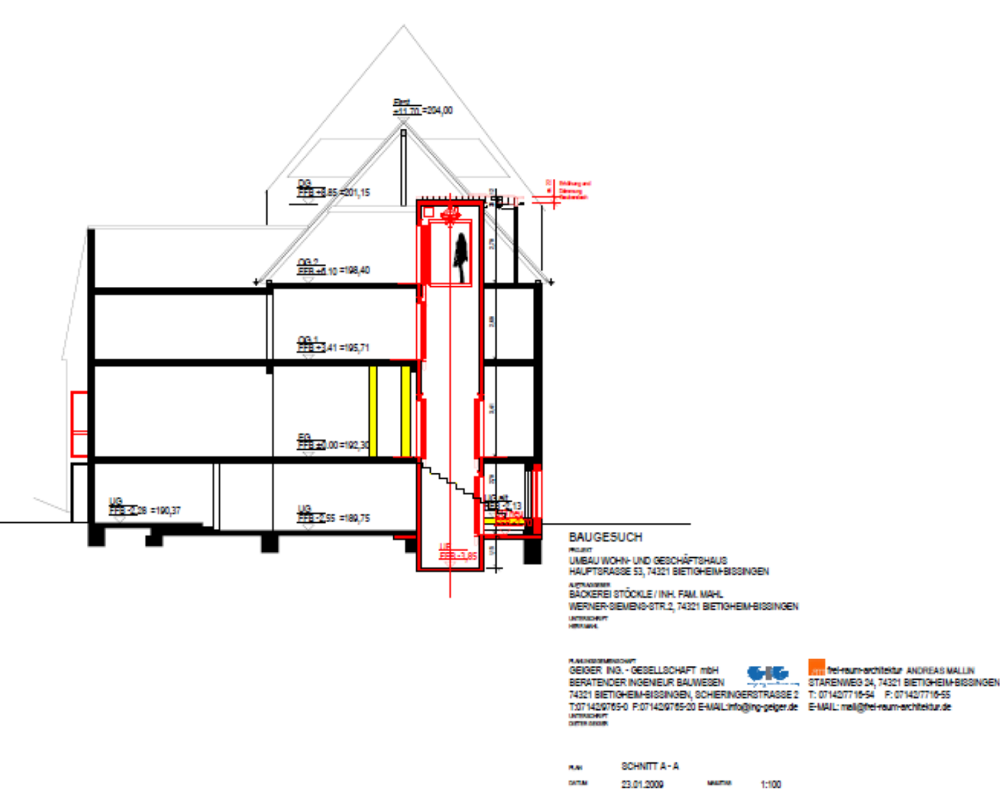 Komplette Umstrukturierung im Erdgeschoß mit Erneuerung und Erweiterung des Bäckerei-Cafés. Einbau eines Aufzuges und neuen Treppenhauses über 4 Etagen.